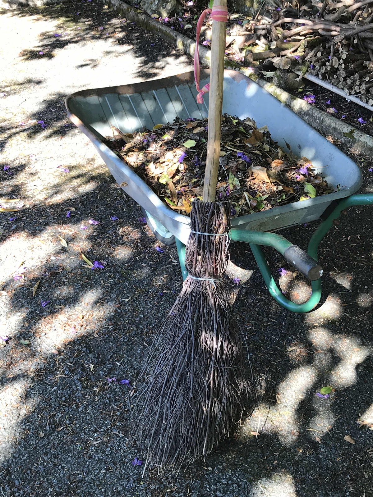 A barrow of driveway sweepings. Food for peonies, which are doing well this year with eleven flower buds. In former years the maximum has been three and sometimes none at all.